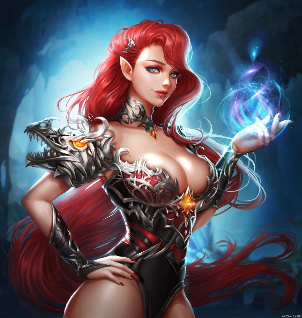 red hair and is wearing an elaborate costume with armor elements, suggesting she might have some combat or magical abilities. In her right hand, she's holding what looks like