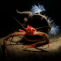 На снимке изображен красный краб, расположенный перед биолюминесцентным кораллом. Коралл украшен нежными белыми усами и, по-видимому, биолюминесцирует, о чем свидетельствует светящийся эффект на окружающую воду. Эта сцена отражает взаимодействие между морской жизнью и ее средой обитания.