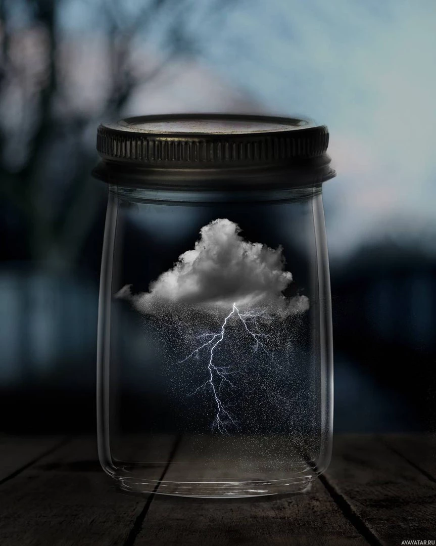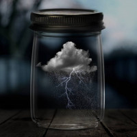 a mason jar with a labeled cloud inside. There is also lightning striking the cloud, creating