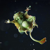 a fantastical scene featuring an amphibian creature that appears to be either jumping or floating in the air. The creature is surrounded by what look like