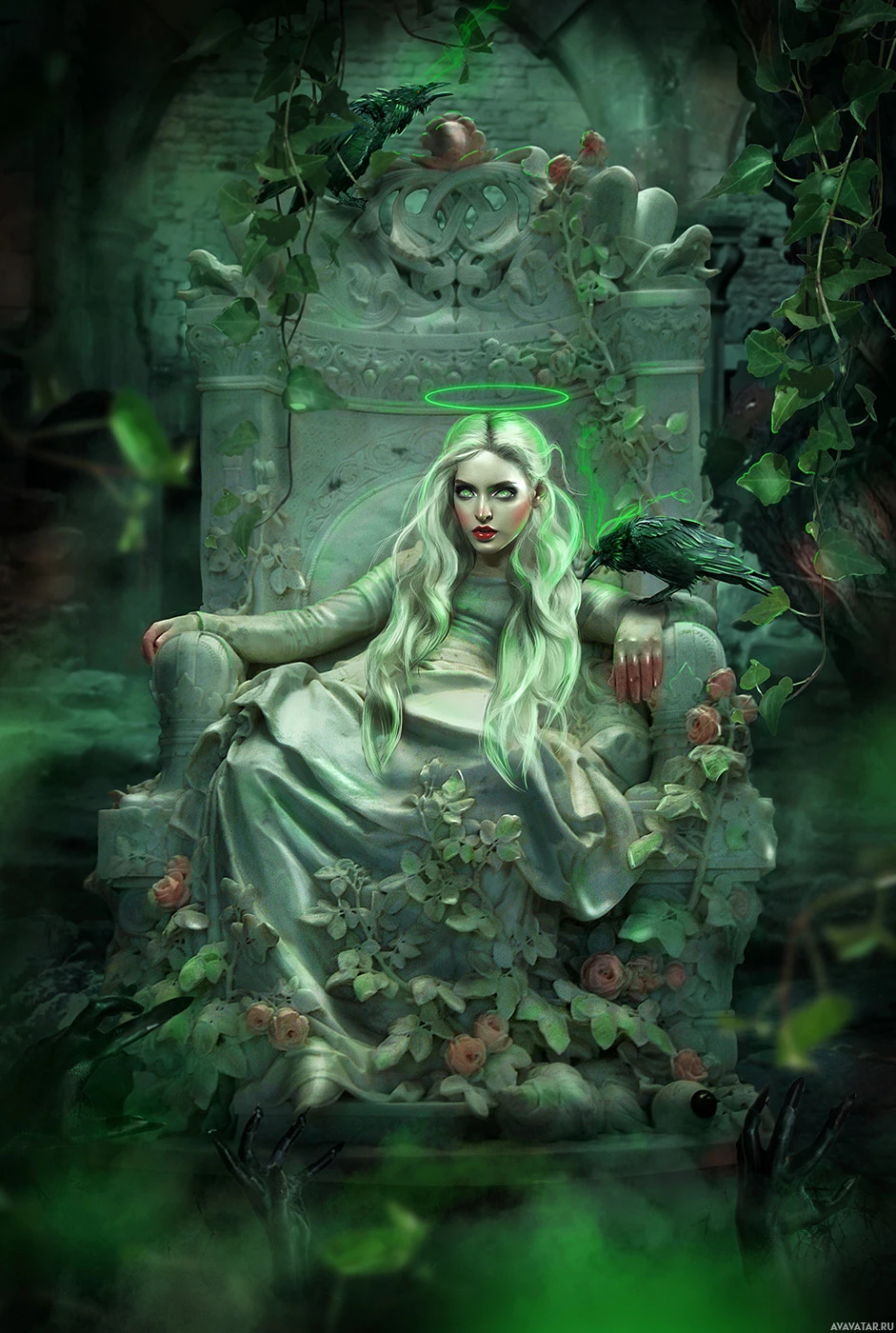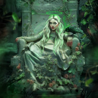 the mystical atmosphere of the scene. Above her, there's a crow perched on a branch, contributing to the theme of nature and wildlife often associated with