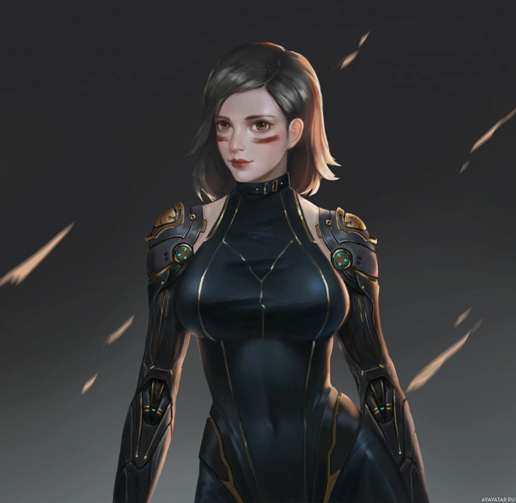 dark hair with a red mark on her forehead, and she is wearing a futuristic-looking armor that suggests a cyberpunk theme. The