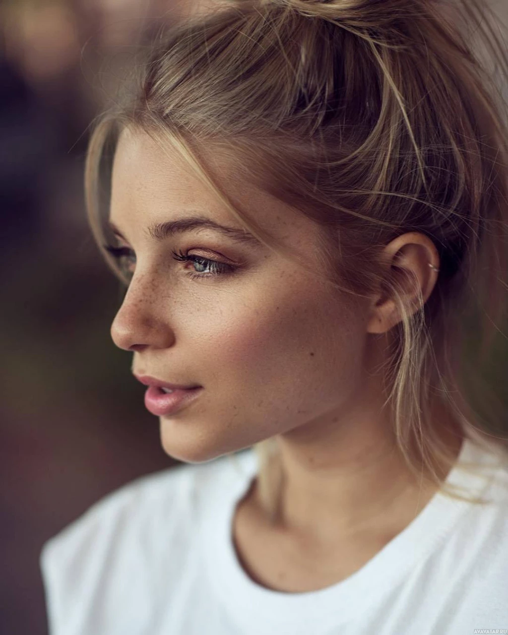 The picture features a young woman with blonde hair, looking directly at the camera. She has a neutral expression on her face and appears to be wearing light makeup that enhances her natural beauty. Her hair is styled in a casual updo, giving off an effortless yet elegant vibe.