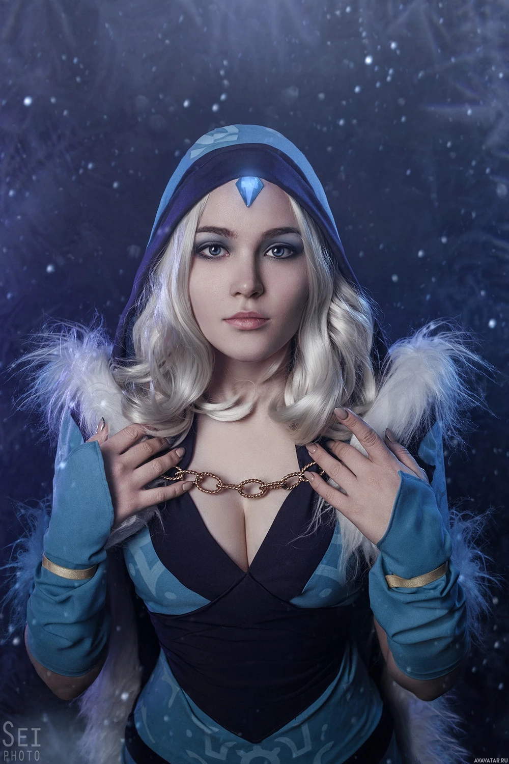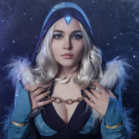 a cosplay costume. She appears to be portraying Crystal Maiden from the game Dota 2, characterized by her