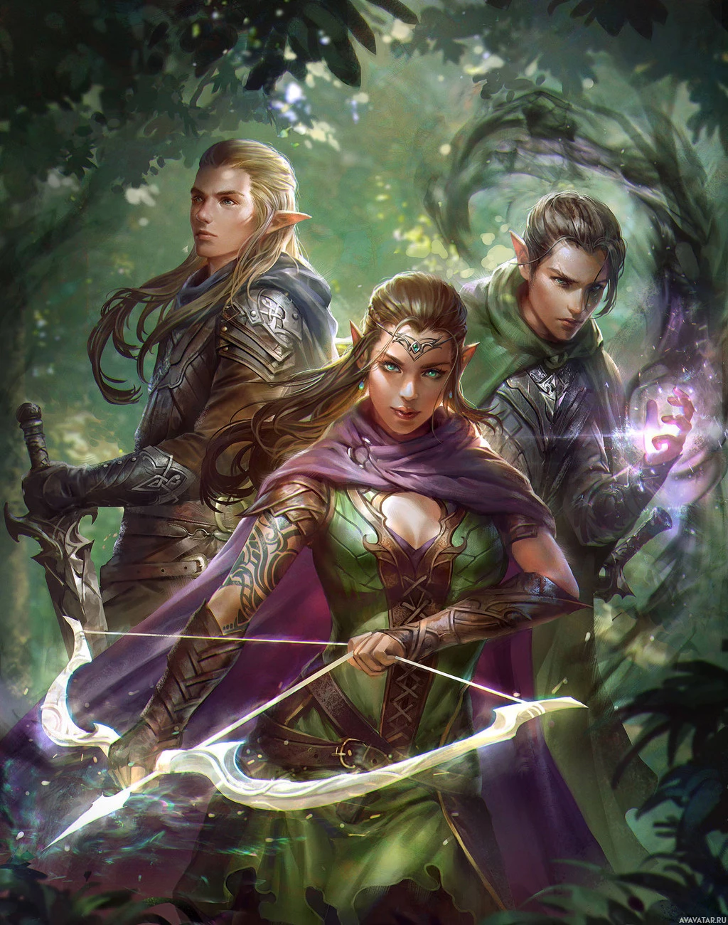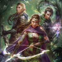 a fantasy setting, likely inspired by elves or similar mythical creatures. One of the individuals is holding a bow and seems to be