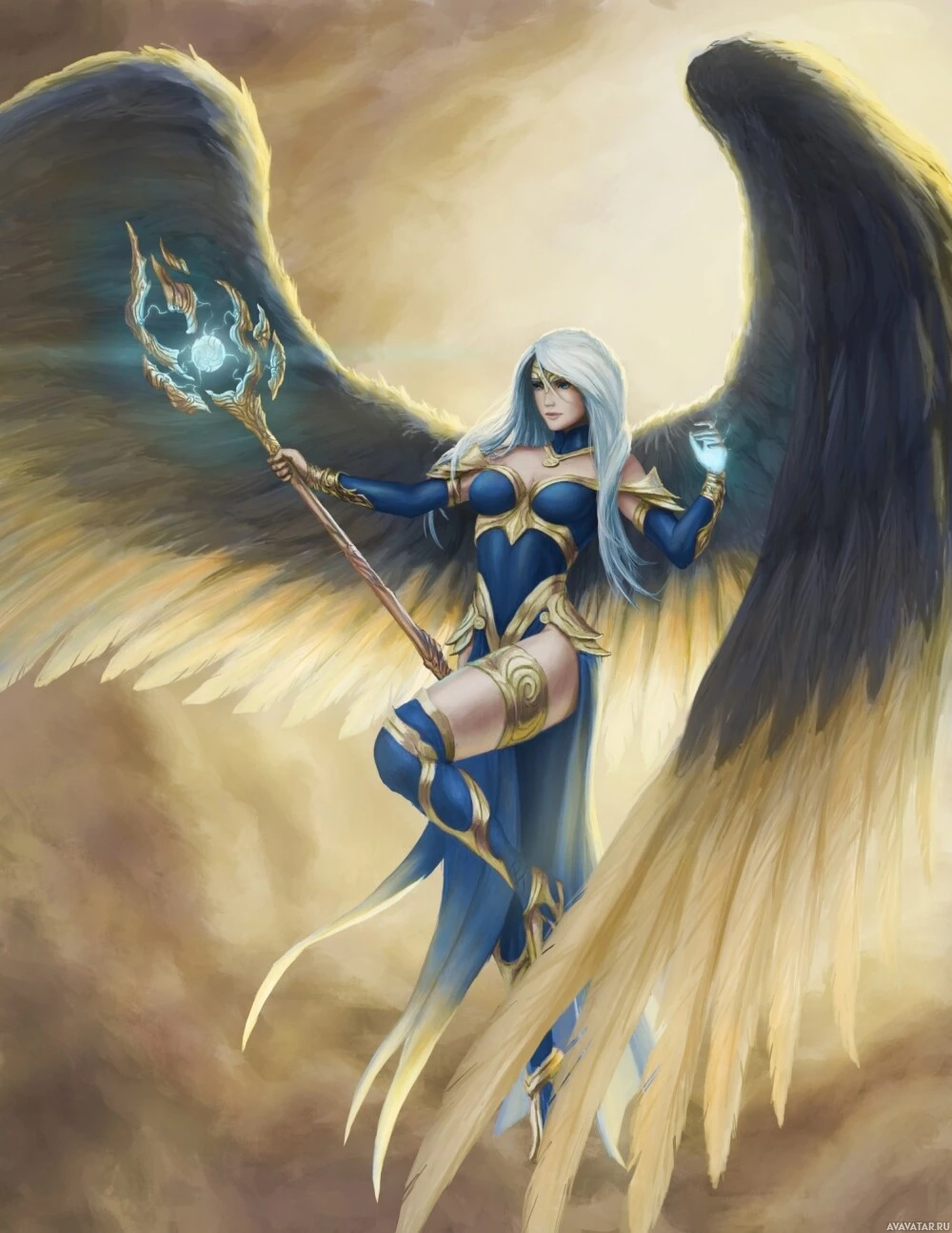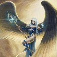 a fantasy character that appears to be an angel. She has wings, which are typical for angels in fantasy artwork. The character is illustrated with human-like features such as a head, torso, and arms. She also holds what looks like a magical wand or staff, suggesting she might have
