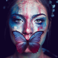 a stark contrast that highlights her face and the butterfly.