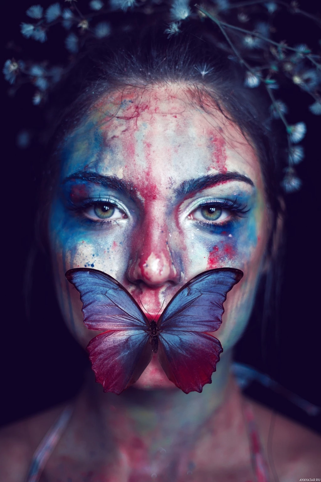 colorful makeup and has a playful or artistic expression on her face. There are also some flowers around her head, which adds to