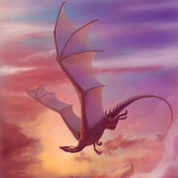 a fantasy dragon soaring through a vibrant, cloud-filled sky. The dragon has large wings and is depicted with a serpentine body, which are common features of dragons in