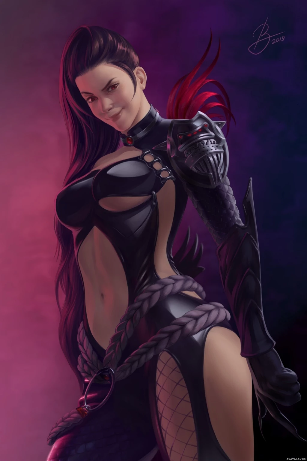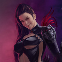 a female warrior or fighter, possibly from a fantasy or video game setting. She is wearing armor and has