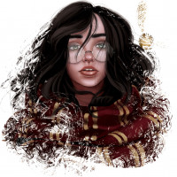 a contemplative expression on her face. She is also depicted wearing a red scarf with