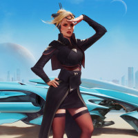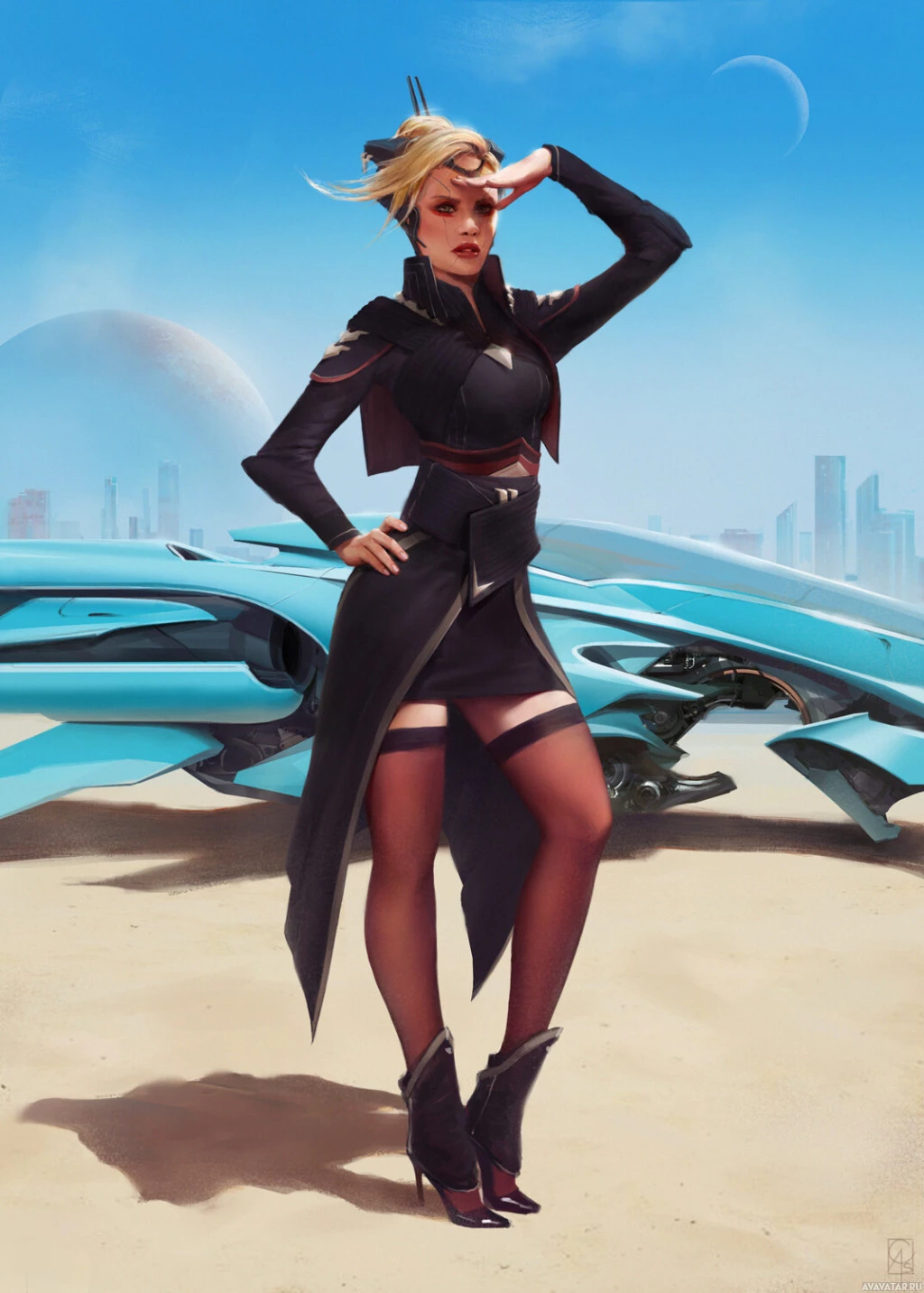 blonde hair styled to the side and is holding her hand up near her face, as if shielding her eyes from the sun or looking into the distance. Behind her are two futuristic vehicles that resemble spacecraft, suggesting