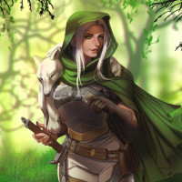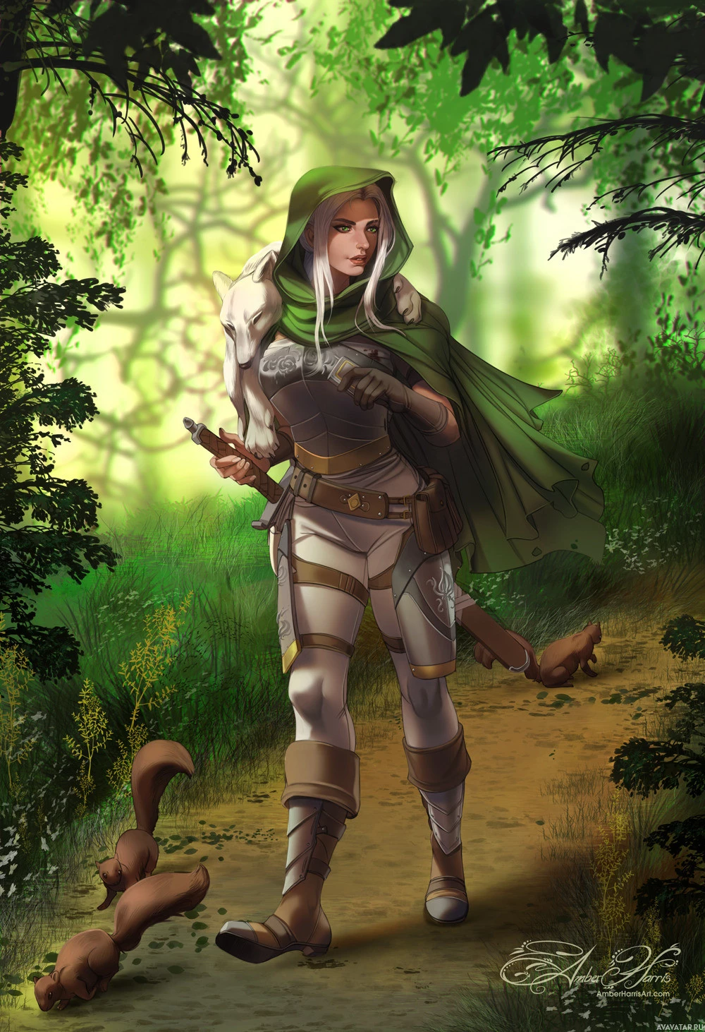 На картинке изображен персонаж, который выглядит как женщина-приключенческая или охотница. У нее светлые волосы, она носит зеленый плащ с капюшоном и стоит в лесу с густой растительностью вокруг нее. Персонаж, кажется, хорошо подготовлен к путешествию, неся рюкзак и, возможно, инструменты или оружие, пригодные для разведки лесов или охоты.