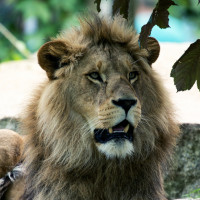 wildlife sanctuary. The lion is facing the camera with its mouth open as if it's roaring or possibly panting due to the heat. Behind the lion are some rocks and