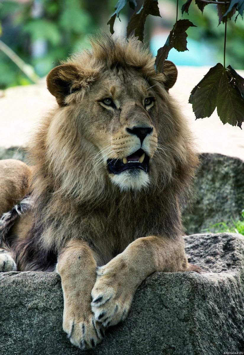 The image features a lion sitting in what appears to be an enclosure, likely at a zoo or