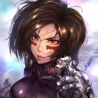 The image shows an animated character known as Alita, from the manga series "Gunnm" by Yukito Kishiro. The character is depicted with a fierce expression and her robotic arm prominently displayed. The background has a blurred effect that gives a dynamic feel to the artwork. The character's design features mechanical elements, suggesting she is a cyborg.