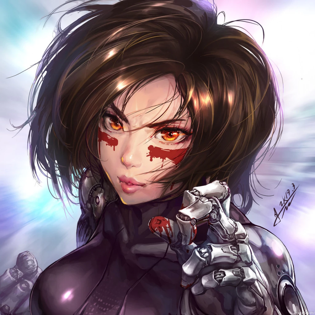 На картинке показан анимированный персонаж, известный как Алита, из серии манги «Гунна» Юкито Киширо. Персонаж изображен с яростным выражением и ее роботизированной рукой. Фон имеет размытый эффект, который дает динамическое ощущение произведения искусства. В дизайне персонажа присутствуют механические элементы, что говорит о том, что она киборг.