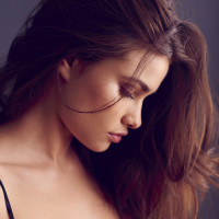 The picture shows a woman with her head tilted downward, looking away from the camera. She has long hair and is wearing a black bra or camisole that appears sheer. The background is neutral and does not distract from the subject. Her expression and posture convey a sense of contemplation or introspection.
