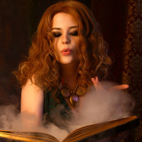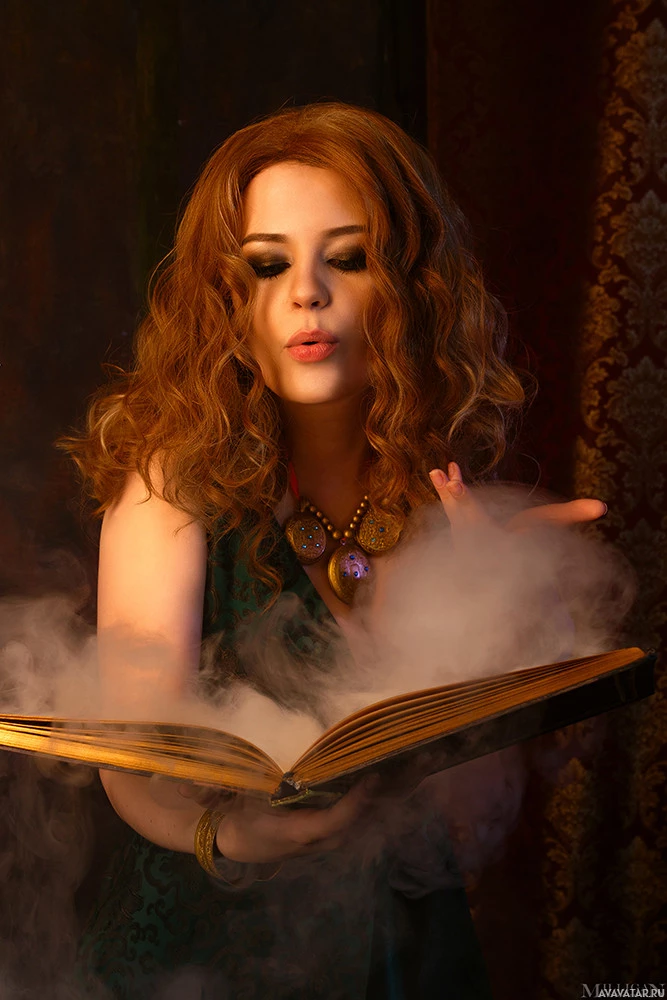 red hair, holding an open book and appearing to be in the middle of reading or possibly reciting something. There is smoke or mist rising from