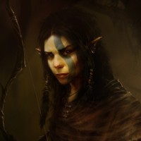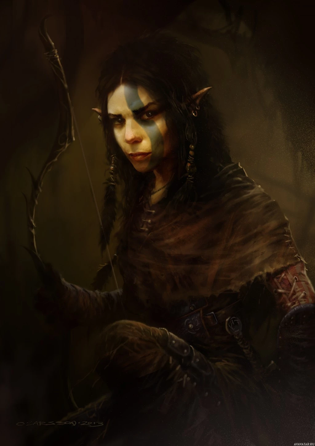 pointed ears and distinct facial features commonly associated with fantasy depictions of elves, such as slender build, sharp cheekbones, and almond-shaped eyes. They are wearing what appears to be traditional
