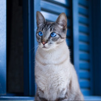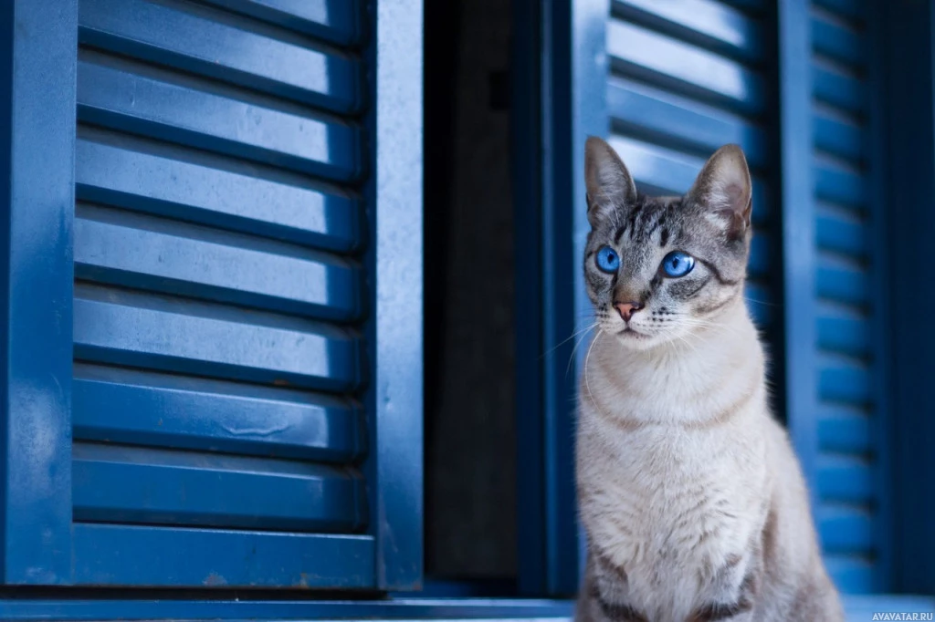 blue eyes sitting near what appears to be the shutters of a window or a door, possibly on a balcony. The cat has a distinctive