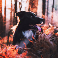 the warm lighting and misty atmosphere. The dog looks alert and attentive, possibly towards something in front of it, which adds