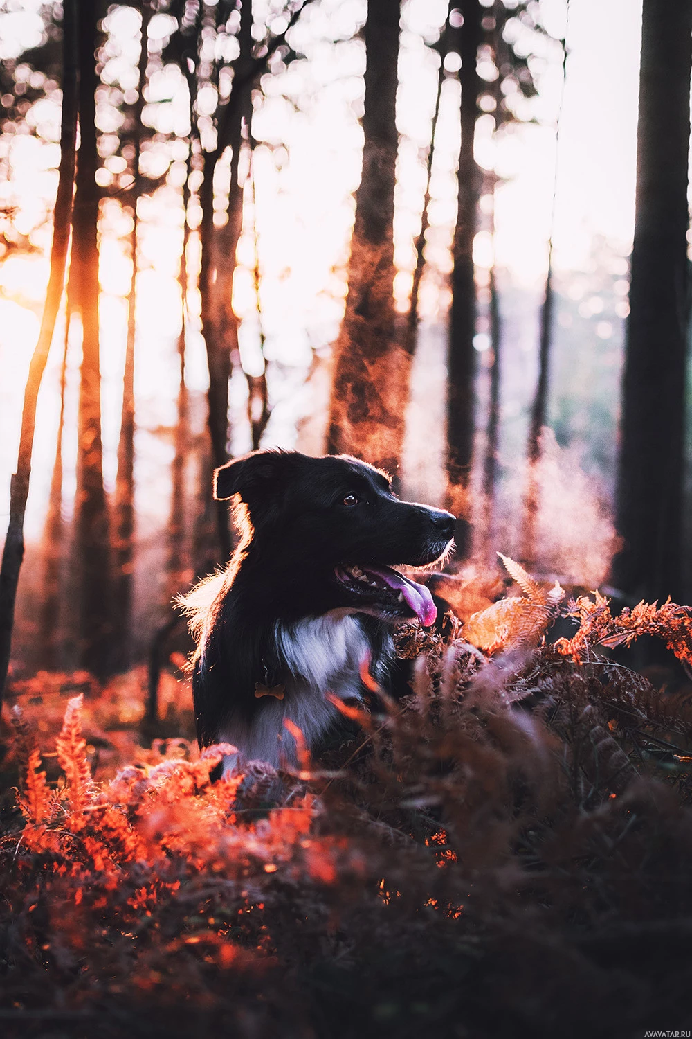 The picture shows a dog sitting on the ground in what appears to be a forest or wooded area during dusk or dawn, as suggested by