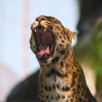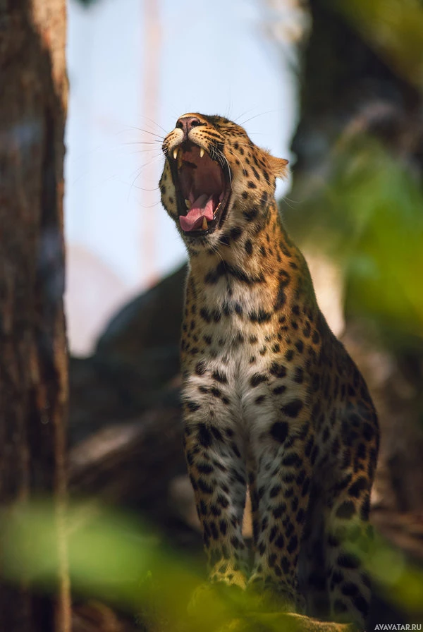 На картине изображен леопард в его естественной среде обитания, окруженный растительностью. Он, кажется, зевает с широко открытым ртом, раскрывая свои острые зубы и розовый язык.