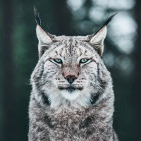 The image shows a lynx, which is an animal known for its distinctive ear tufts and eye markings. It appears to be sitting on the ground, possibly in a snowy environment given the surrounding foliage and the cold-looking atmosphere.