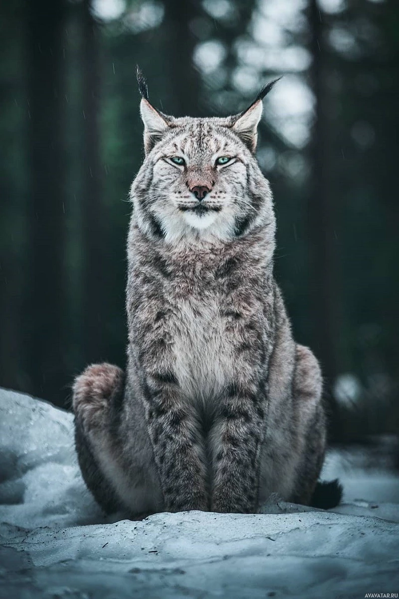 На картинке изображена рысь, которая является животным, известным своими отличительными ушными пучками и глазными отметинами. Похоже, что он сидит на земле, возможно, в снежной среде, учитывая окружающую листву и холодную атмосферу.