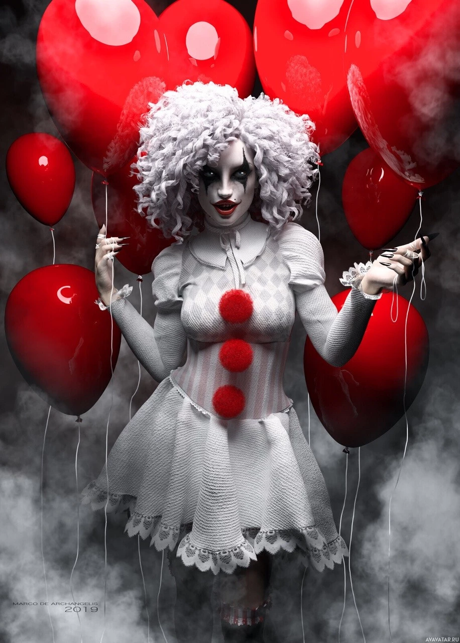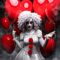 red balloons floating around the character, giving the impression of a surreal or eerie scene. The clown appears to be holding onto the strings of the balloons, which adds to the tension in the image.