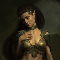the fantasy world. She also has jewelry or accessories on her body and neck, which adds to her regal appearance. The background is dark and moody, with