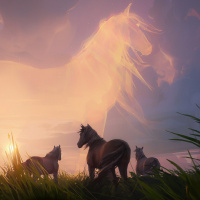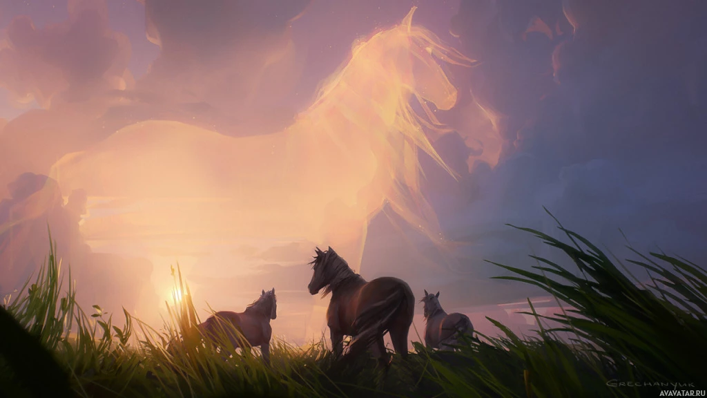 Картинка показывает спокойный пейзаж на закате. В траве стоят несколько лошадей, обращенных к тому, что кажется водоемом или светящимся источником света. Небо окрашено оранжевыми и розовыми оттенками, предполагая, что это может быть ранний вечер или сумерки.