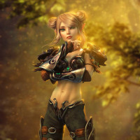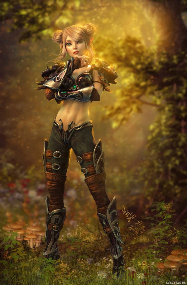 a forest setting, with a soft, misty atmosphere around her. She has pointed ears indicative of an elven race, and she's wearing armor that includes a chest piece and gauntlets, suggesting she might be a warrior or guardian type within her