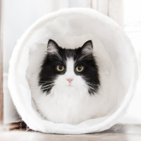 На картине изображена кошка, сидящая внутри белого цилиндрического объекта. У кошки черный и белый мех с некоторыми темными областями, которые могут указывать на отметины табби. Он смотрит прямо в камеру с внимательным взглядом. Фон размыт, но предполагает домашнюю обстановку в помещении.