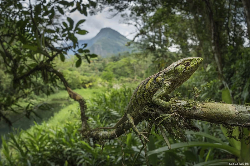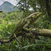 a water body in the background. This type of lizard is likely found in the rainforests of