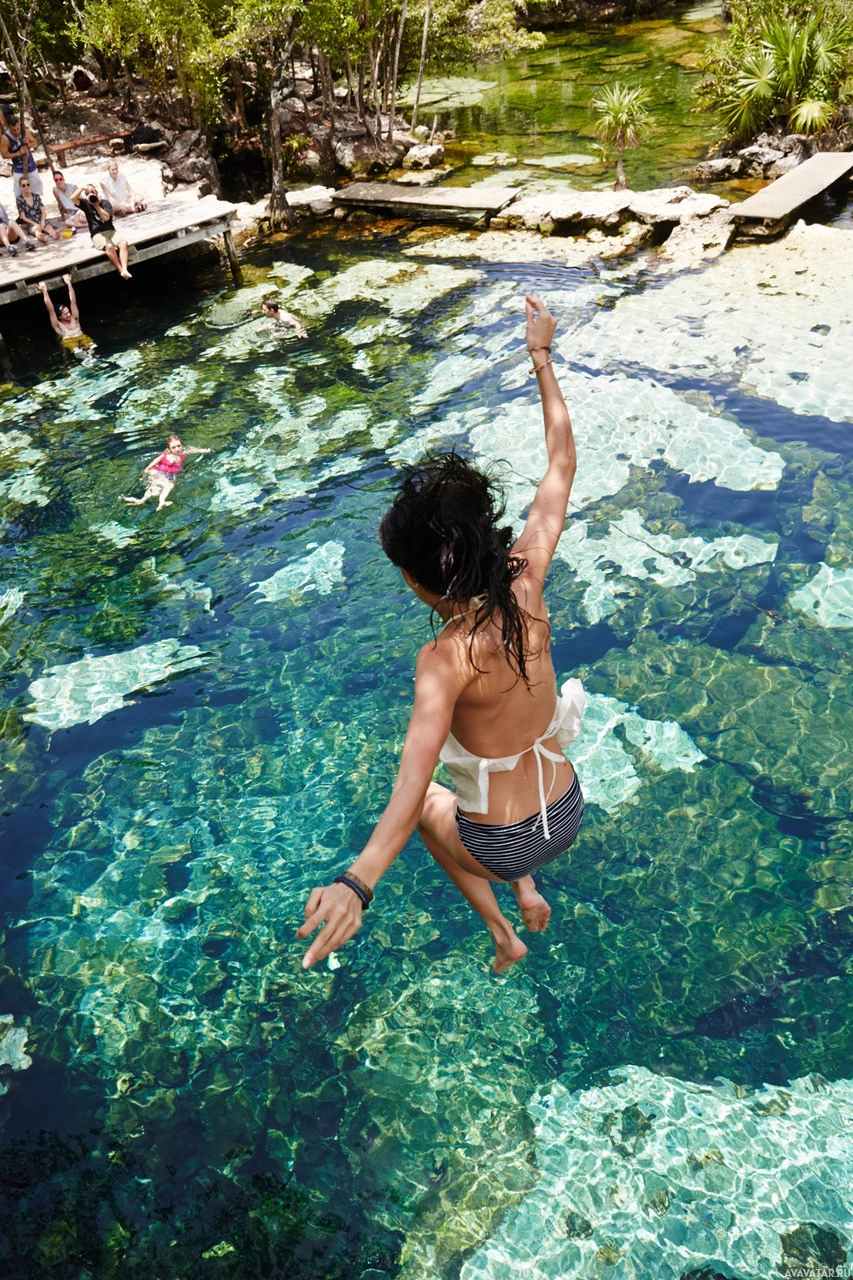 long hair. She is wearing a bikini and seems to be jumping into water from a platform above