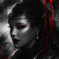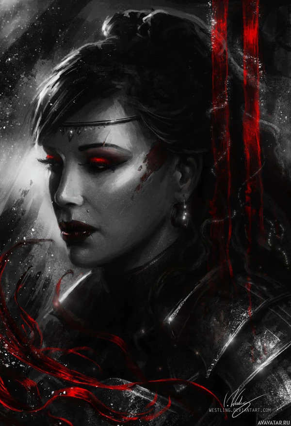 a female character with dark hair. She is depicted in a contemplative or intense expression, wearing what appears to be a futuristic or fantasy-inspired outfit that includes red and black elements. Her gaze is directed slightly off to the side, suggesting