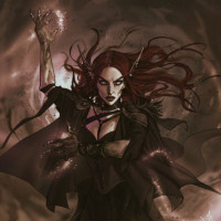 red hair and is wearing what looks like dark robes or armor, which might suggest she's a witch or a sorceress given the context of "drow" which is often associated with dwarves in fantasy genres, but here it could imply a type of magical or mythical creature. The character is standing amidst a chaotic and dark environment, possibly casting a spell or performing some