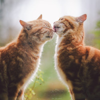 На снимке изображены два молодых котята табби. Один из котят облизывает лицо компаньона, пока они сидят рядом. Они кажутся снаружи, о чем свидетельствует естественный свет и наружная обстановка. Котята участвуют в игривом или ласковом взаимодействии, типичном для кошачьего поведения.