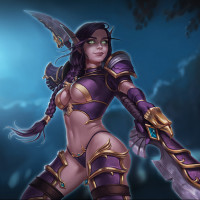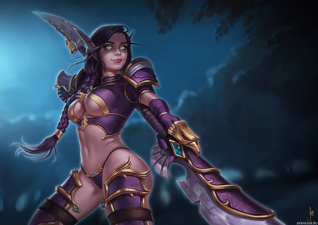a female character dressed in fantasy armor, resembling that of an elf from the Warcraft universe. She is wearing a purple outfit with