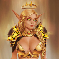 an illustrated character that appears to be a fantasy-themed elf. She is wearing armor that looks like it's made of gold, with