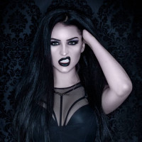 a dark backdrop that appears to be designed for a more dramatic or provocative photo shoot. The woman's expression is intense and she seems to be looking directly at the camera with her mouth slightly open, which adds to the overall impact of the image.
