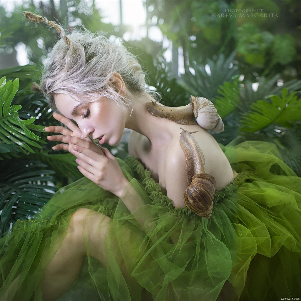 blonde hair, who appears to be sitting in a lush environment that could be a jungle or a greenhouse. She is wearing an outfit that seems to incorporate elements of nature, such as plants, and she has snail shells adorning her shoulder, giving the impression that she might have a close