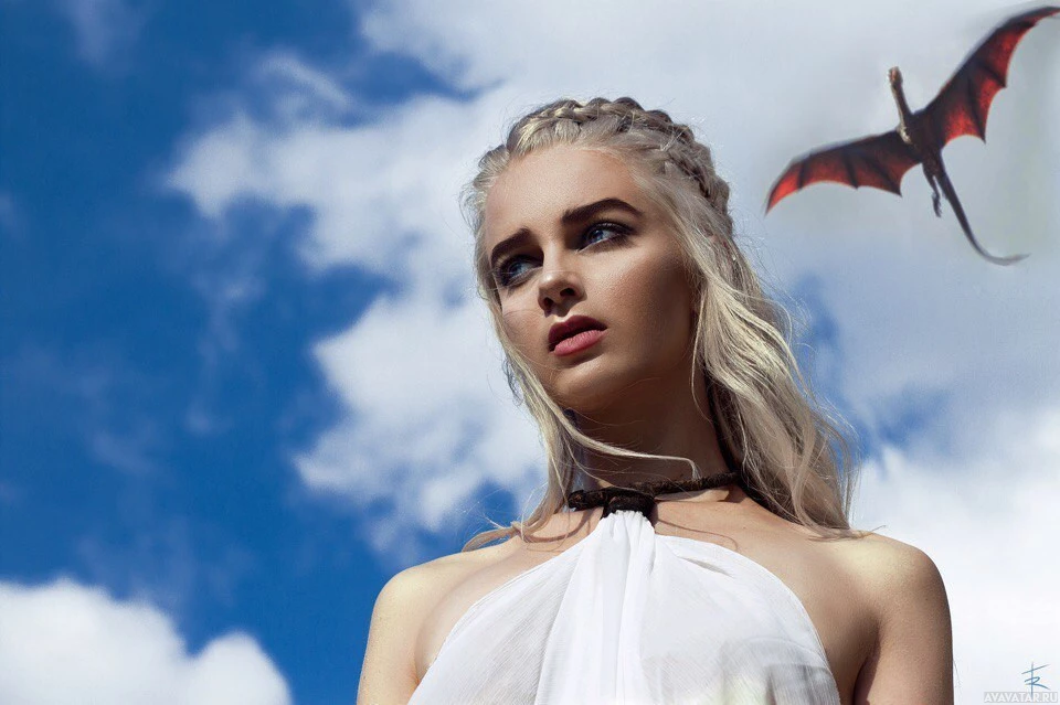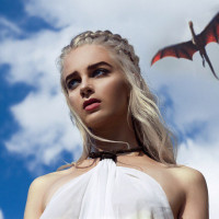 a blonde braid and dragon motifs on her attire, which are characteristic elements of Daenerys' style within the show. Additionally, there is an image of a dragon placed behind her head, suggesting her association with