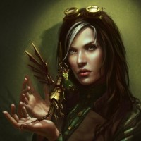 a young woman with short, dark hair and striking blue eyes. She is wearing what appears to be an aviator-style helmet with goggles pushed up onto her forehead, suggesting she might be engaged in some sort of adventure or exploration activity. Her attire consists of