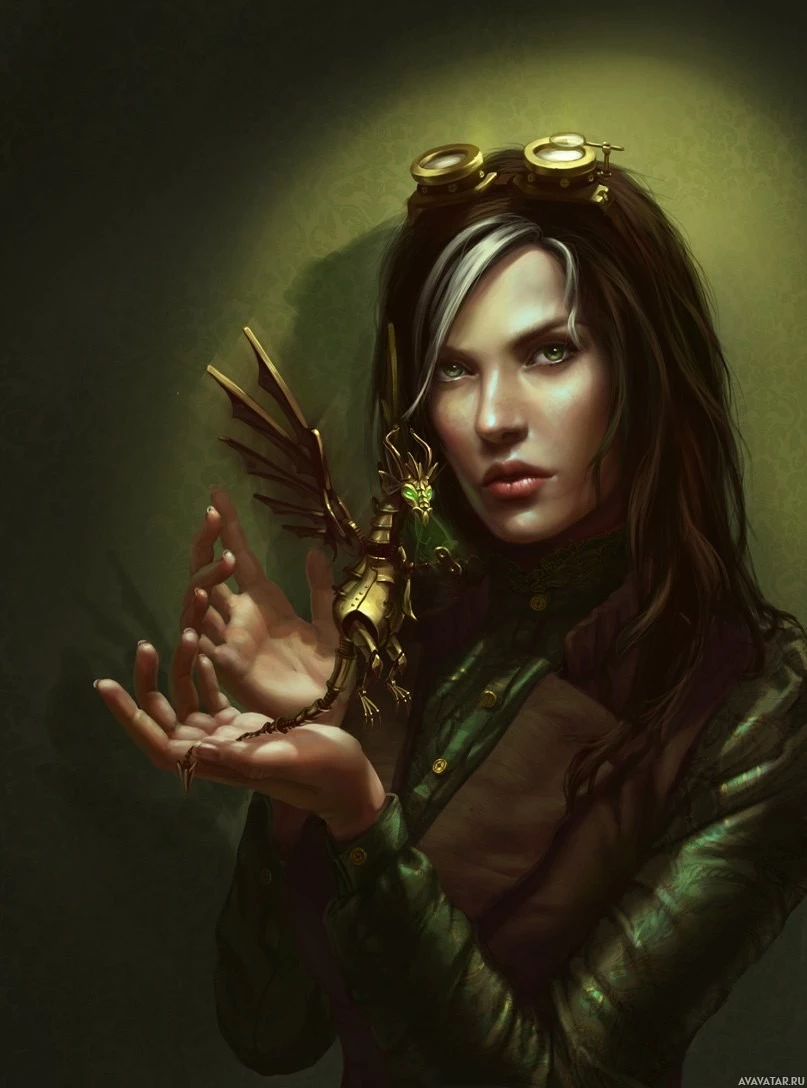 a green jacket with a distinctive brown collar and cuffs, which could indicate a historical or fantasy setting for the image. In her hands, she holds what seems to be an insect or