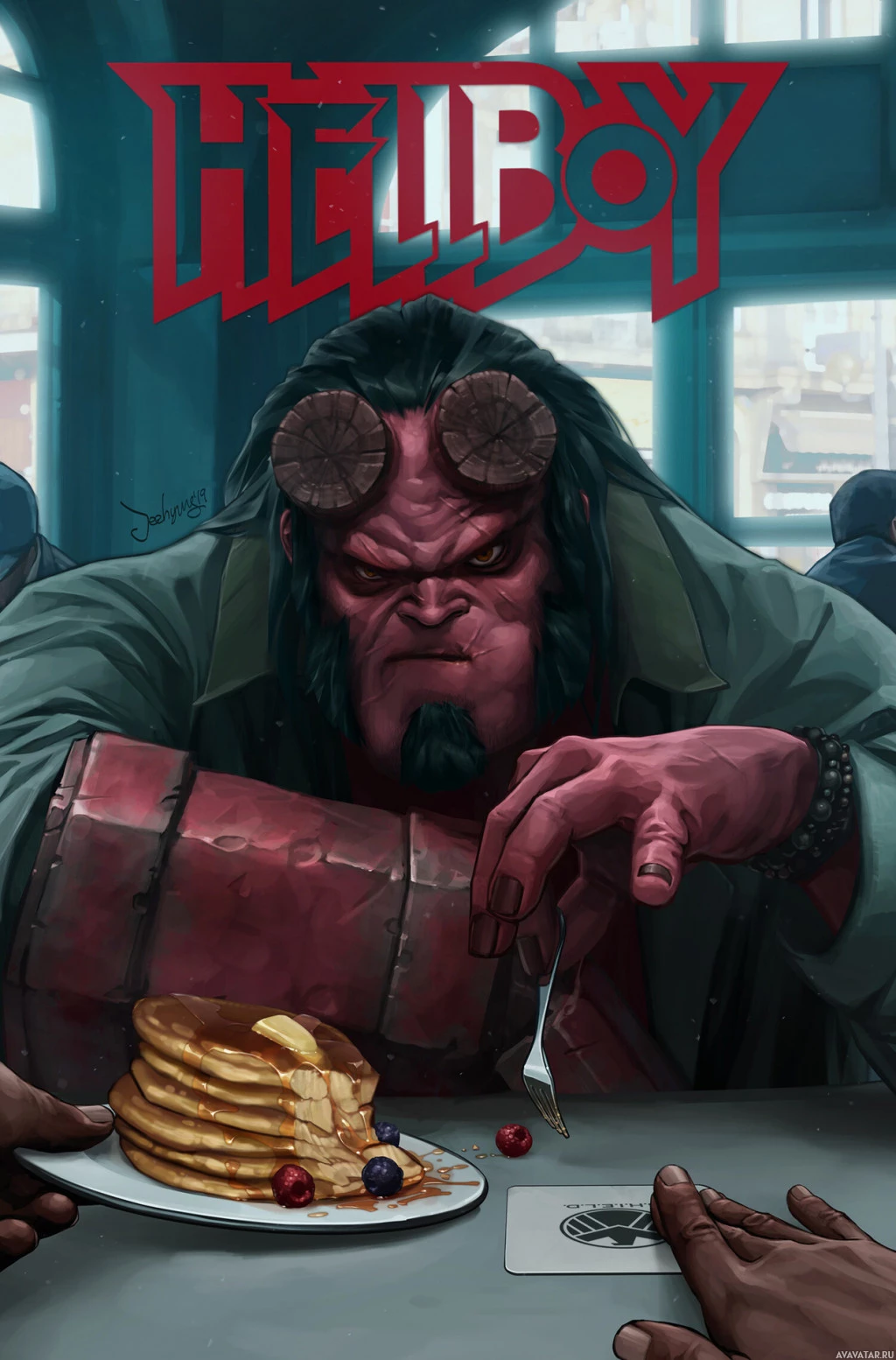 a muscular build, large horns on his head, and is holding a cup in one hand while eating pancakes. Surrounding him are several other figures who appear to be engaged in conversation or observing Hellboy's actions. The style of the image suggests it could be related to