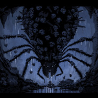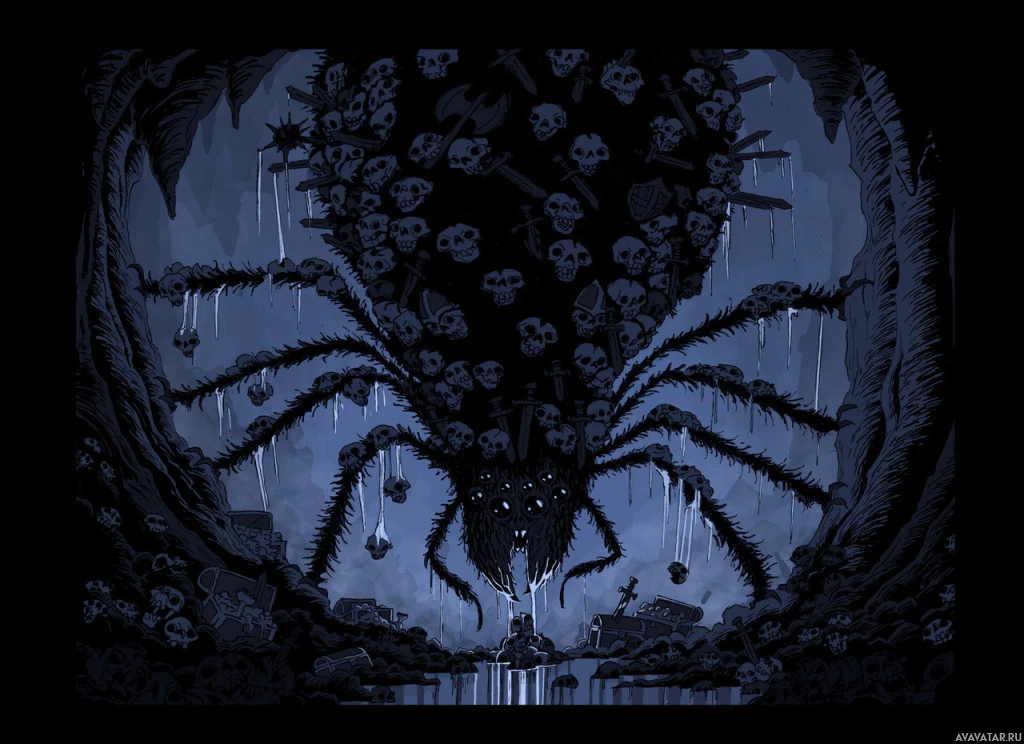 a large spider at the center. The spider is surrounded by an assortment of skulls, suggesting a theme of death or danger. There are also other spiders scattered around the edges, contributing to
