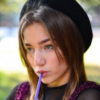 a young woman taking a sip from a frozen beverage, which appears to be a slushy or icy drink. She has